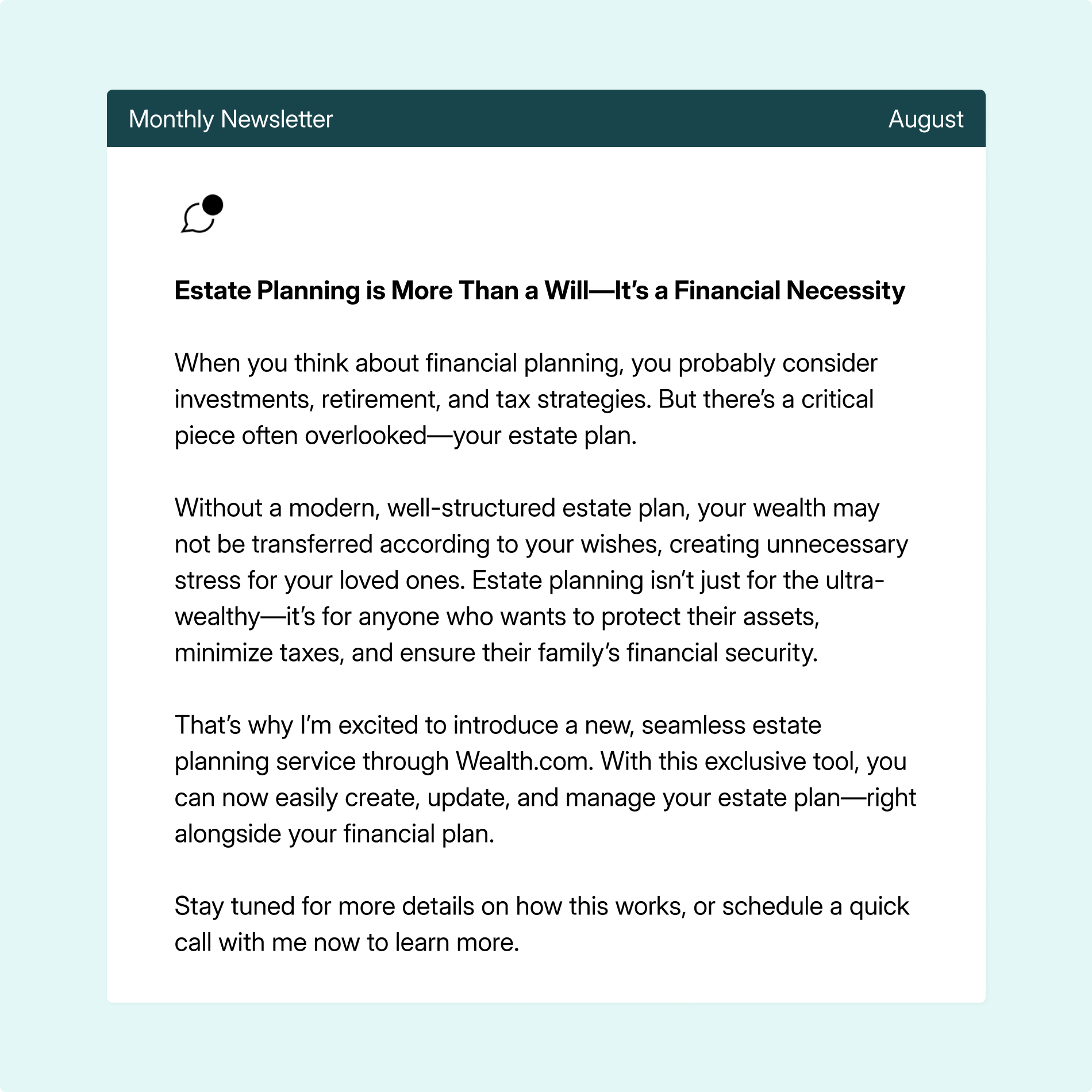 Position yourself as a leader in your community. A customizable press release helps you share your Wealth.com partnership with local media, demonstrating credibility and dedication to client well-being.