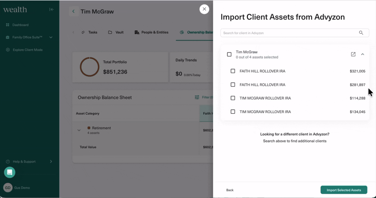 Wealth.com is thrilled to announce that our platform is the first estate planning solution to offer a direct integration with Advyzon, the all-in-one wealth management platform used by over 2,000 financial advisors nationwide. This integration helps advisors directly import their client and asset data seamlessly into Wealth.com in just a few clicks. Advisors can customize what clients or assets they wish to import, making this a flexible solution designed to expedite manual tasks like entering clients one by one. More information coming on this soon!