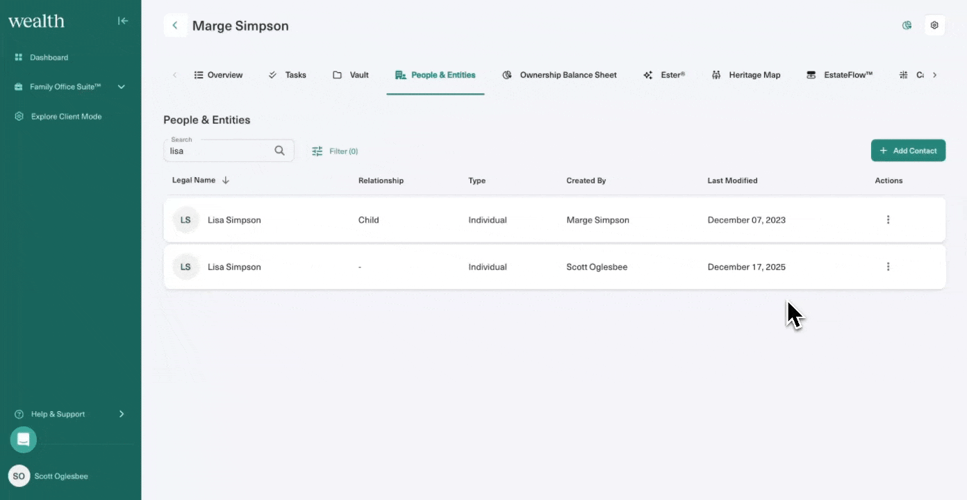 Start by searching the names of your clients in the People & Entities tab, then select the three dots next to one of those contacts to click Merge Contact. From there, you can choose which contact you’d like to assign as the primary.