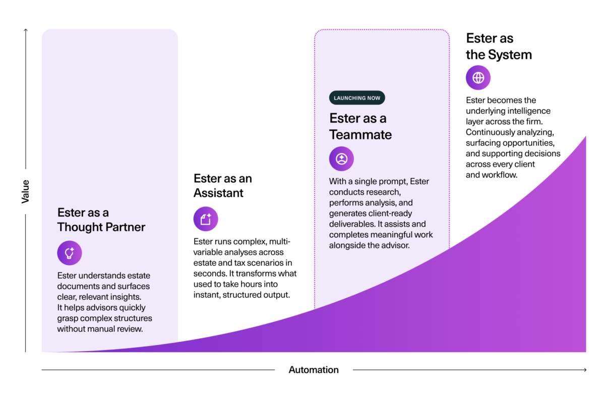This progression reflects a broader shift in how AI supports advisors – from insight to execution. Ester Intelligence has evolved through distinct stages: first as a thought partner, helping advisors interpret estate documents; then as an assistant, capable of running complex tax and estate analyses. With this release, it reaches Level 3 – operating as a teammate that can conduct research, perform analysis and generate client-ready deliverables within a single workflow.