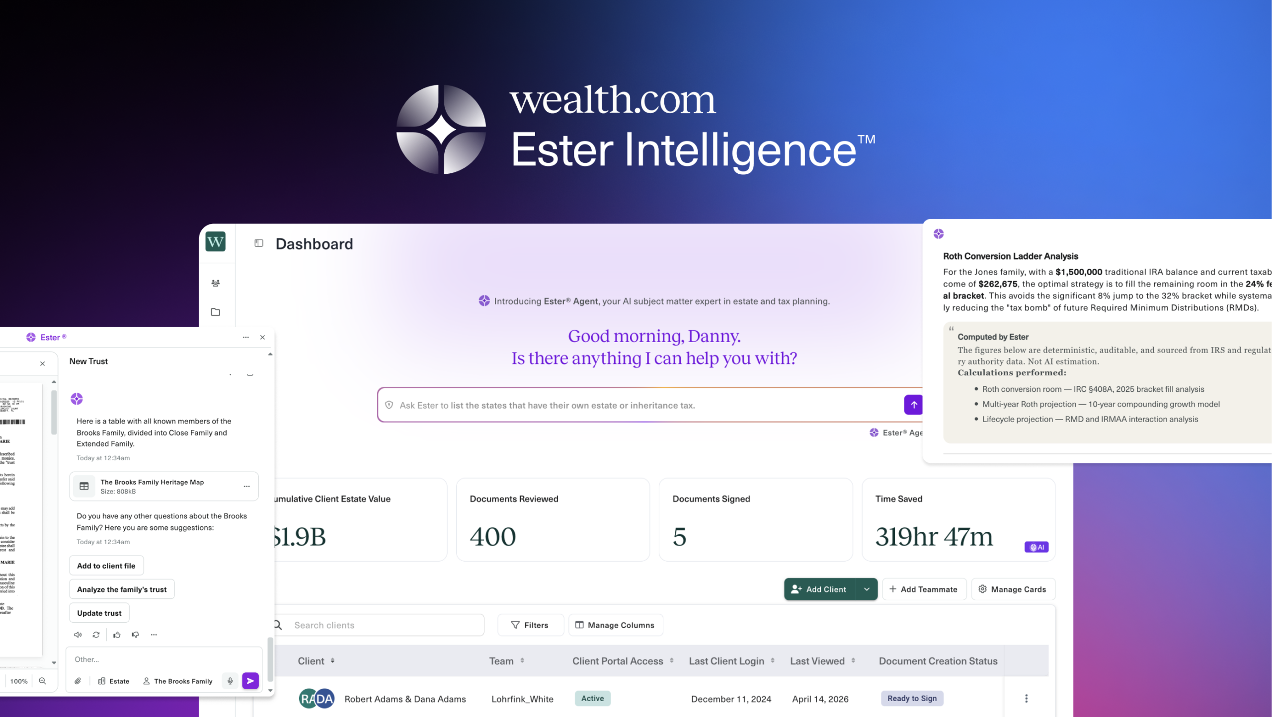 At the core of the platform is Ester Intelligence, Wealth.com’s proprietary AI engine trained on estate planning, tax planning and advanced wealth scenarios and reporting. Embedded directly within the Wealth.com platform, Ester powers advisor workflows end-to-end, while also enabling firms to integrate its capabilities into their own AI infrastructure. Unlike generic language models, Ester Intelligence is purpose-built for financial planning and designed to deliver deterministic, auditable outputs in high-stakes advisory environments. In 2025, Ester Intelligence processed over 100,000 estate documents and performed more than 1,000 deterministic calculations per estate distribution, enabling advisors to deliver sophisticated planning with greater speed, consistency and scale.