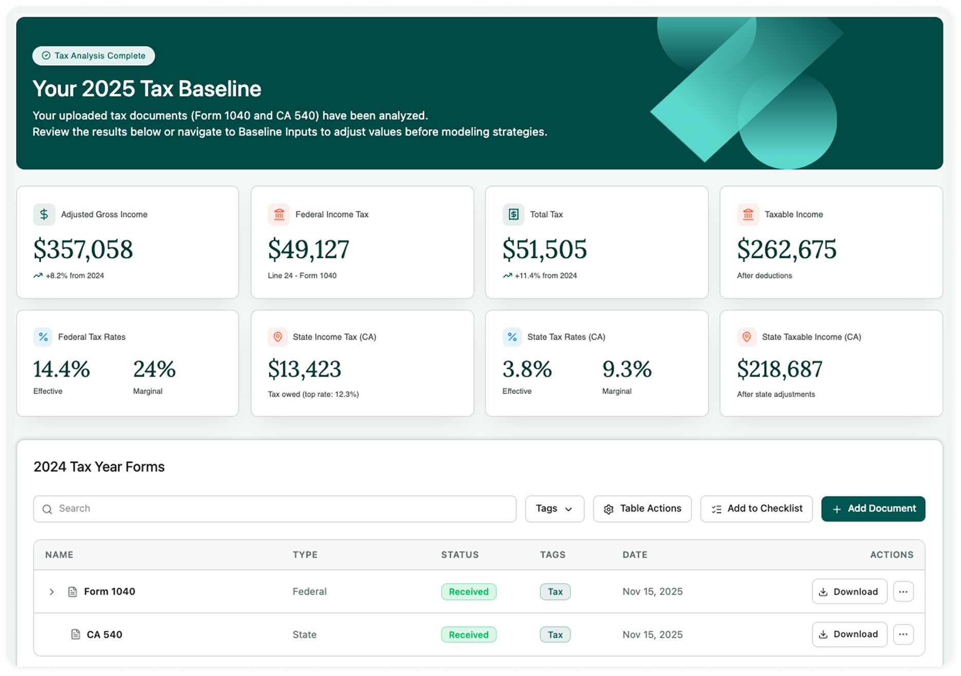 Tax planning used to mean hours of manual entry and dated interfaces. We realized there had to be a better way. So we built Wealth.com Tax Planning. It takes the complexity of the tax code and transforms it into clear, actionable intelligence. It’s powerful enough for your most complex clients, yet simple enough to use every day.
