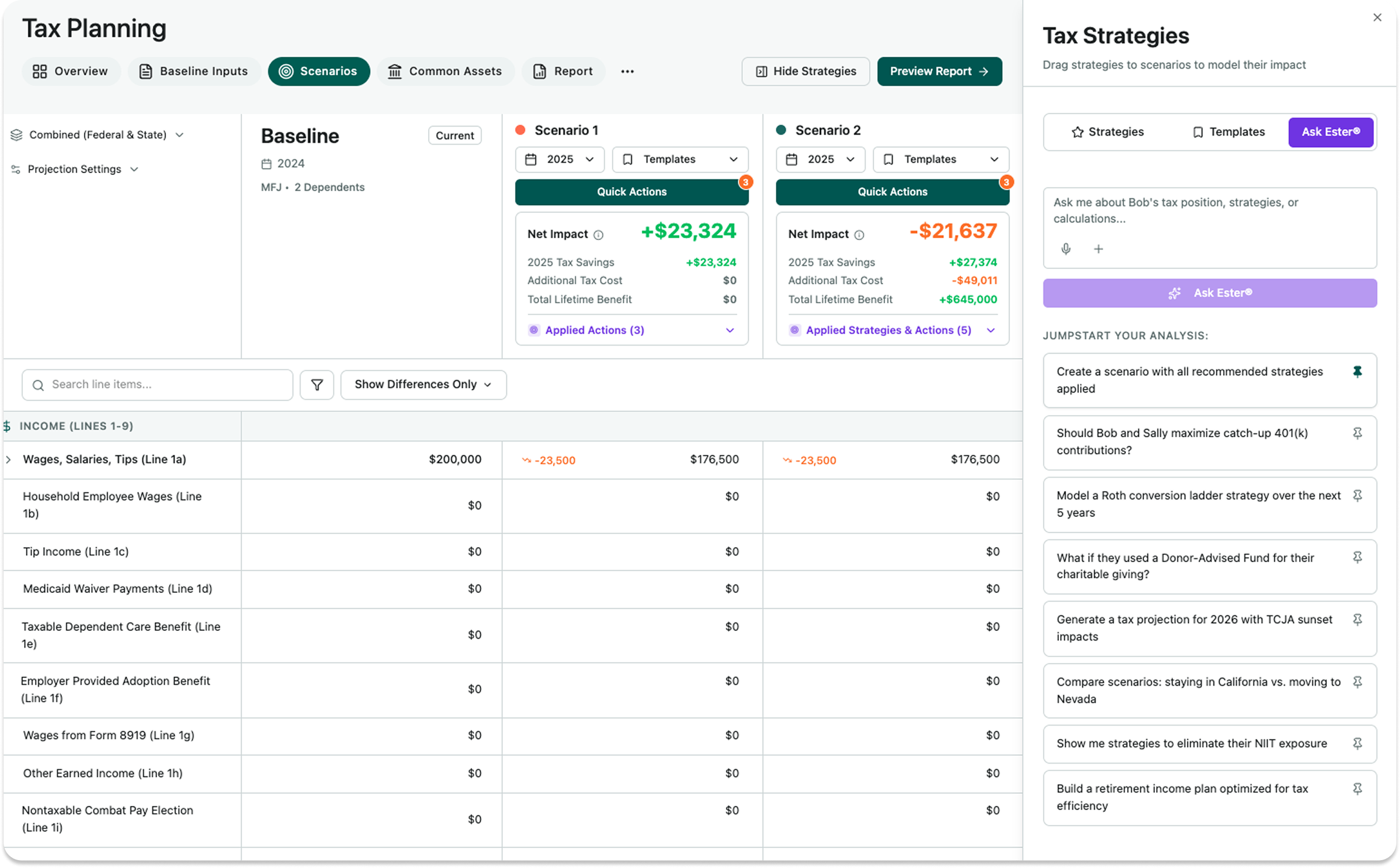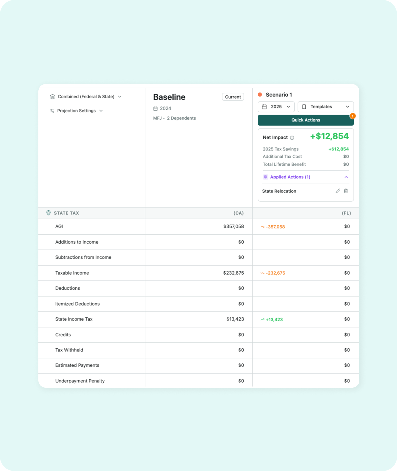 Clients love to ask, “What if I moved to Florida?” Unlike other tools, we allow you to model a change of residence side-by-side against their current state in a single view.