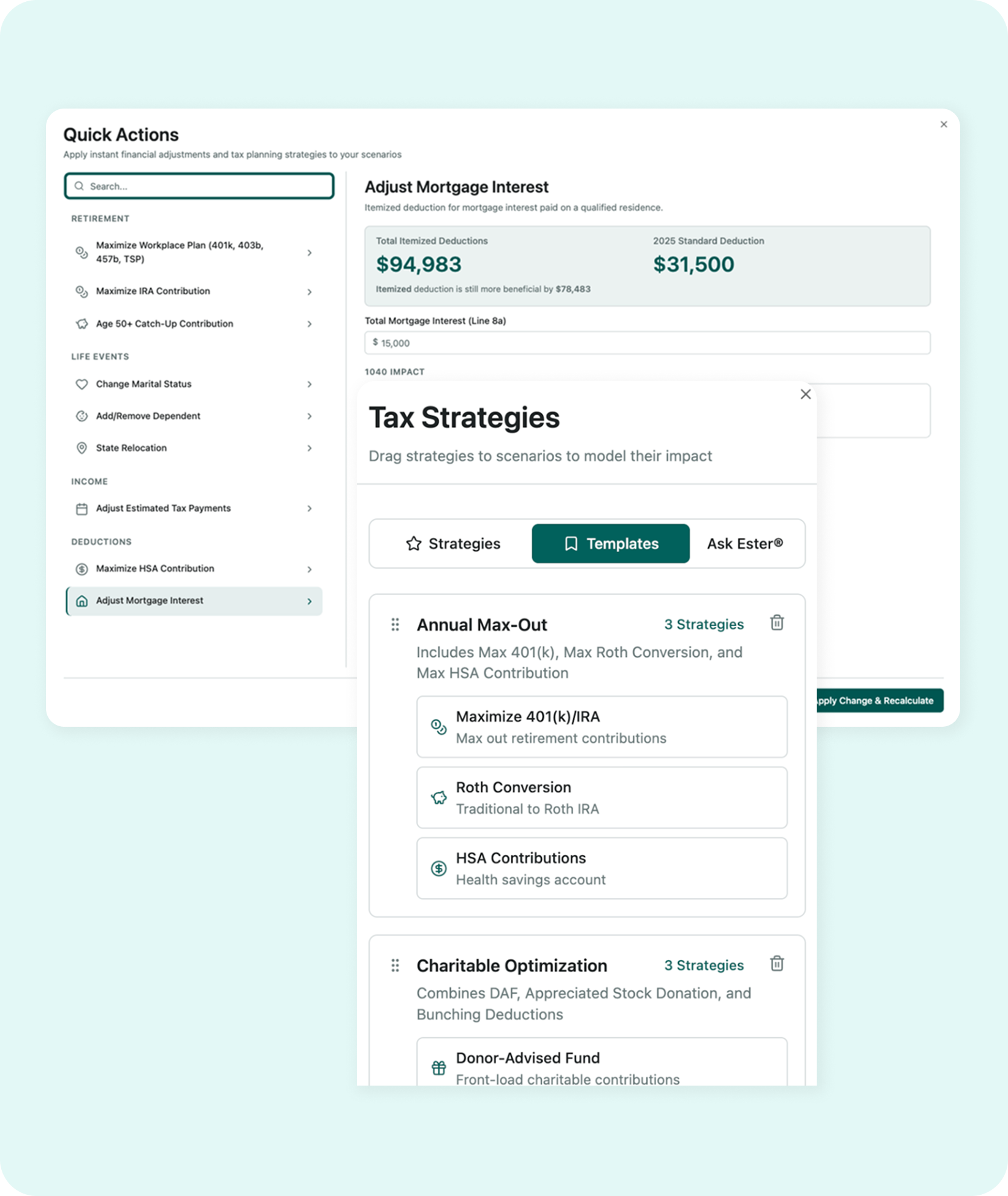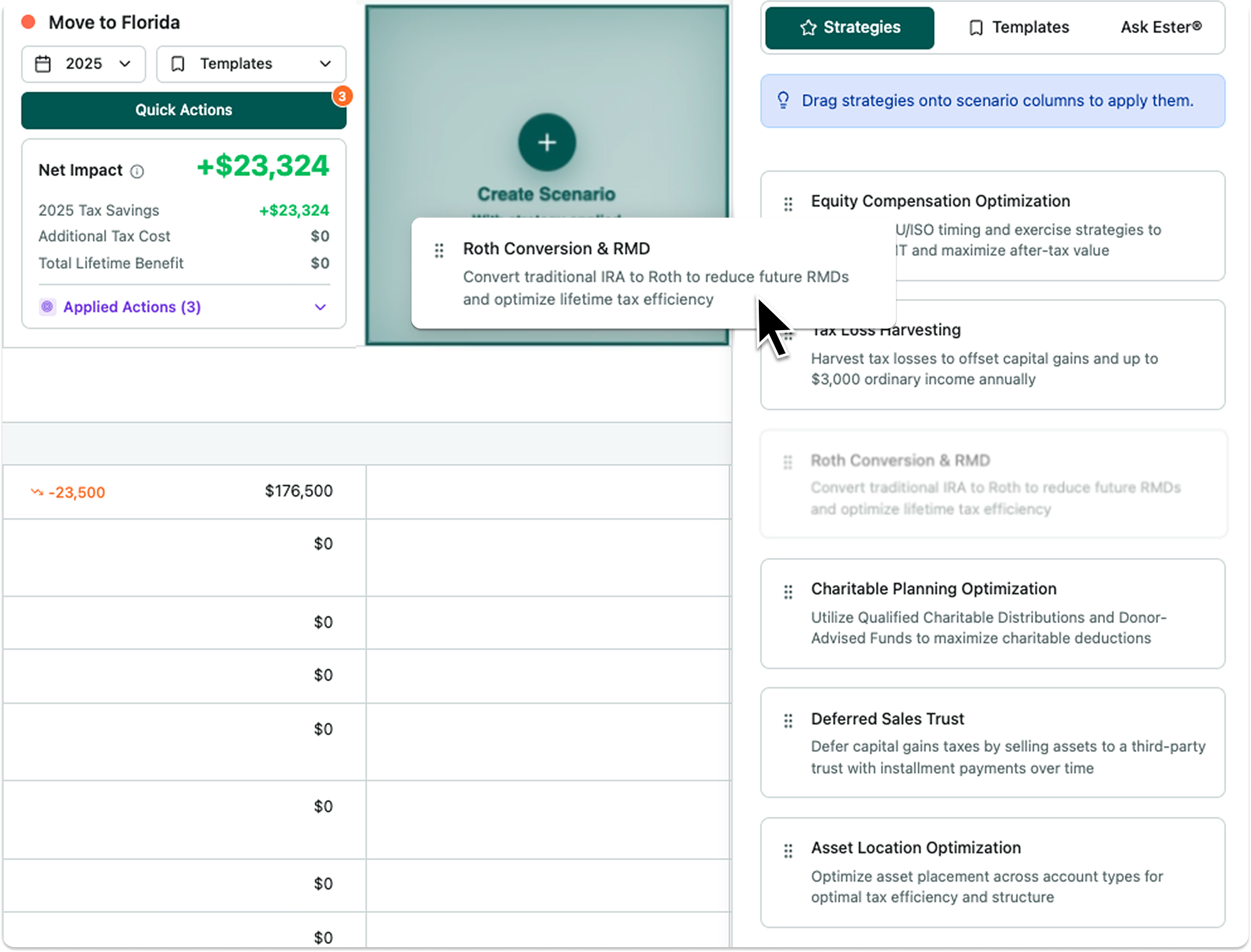 Stop editing individual line items. Use Quick Actions to drag and drop strategies, like a Roth conversion or maxing out a 401(k), instantly. Have a standard playbook? Create a Template of strategies and apply it to any client in one click.