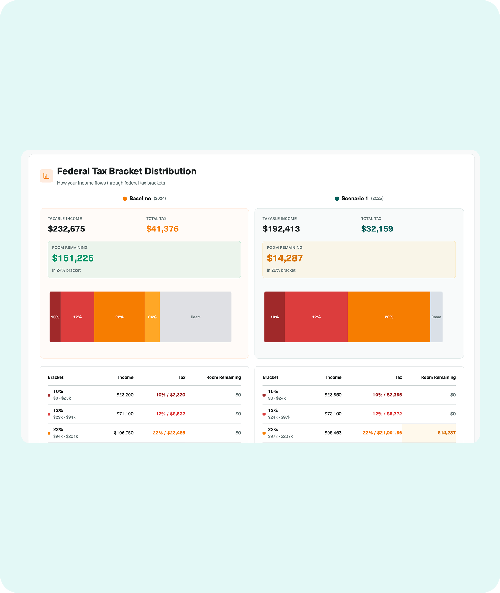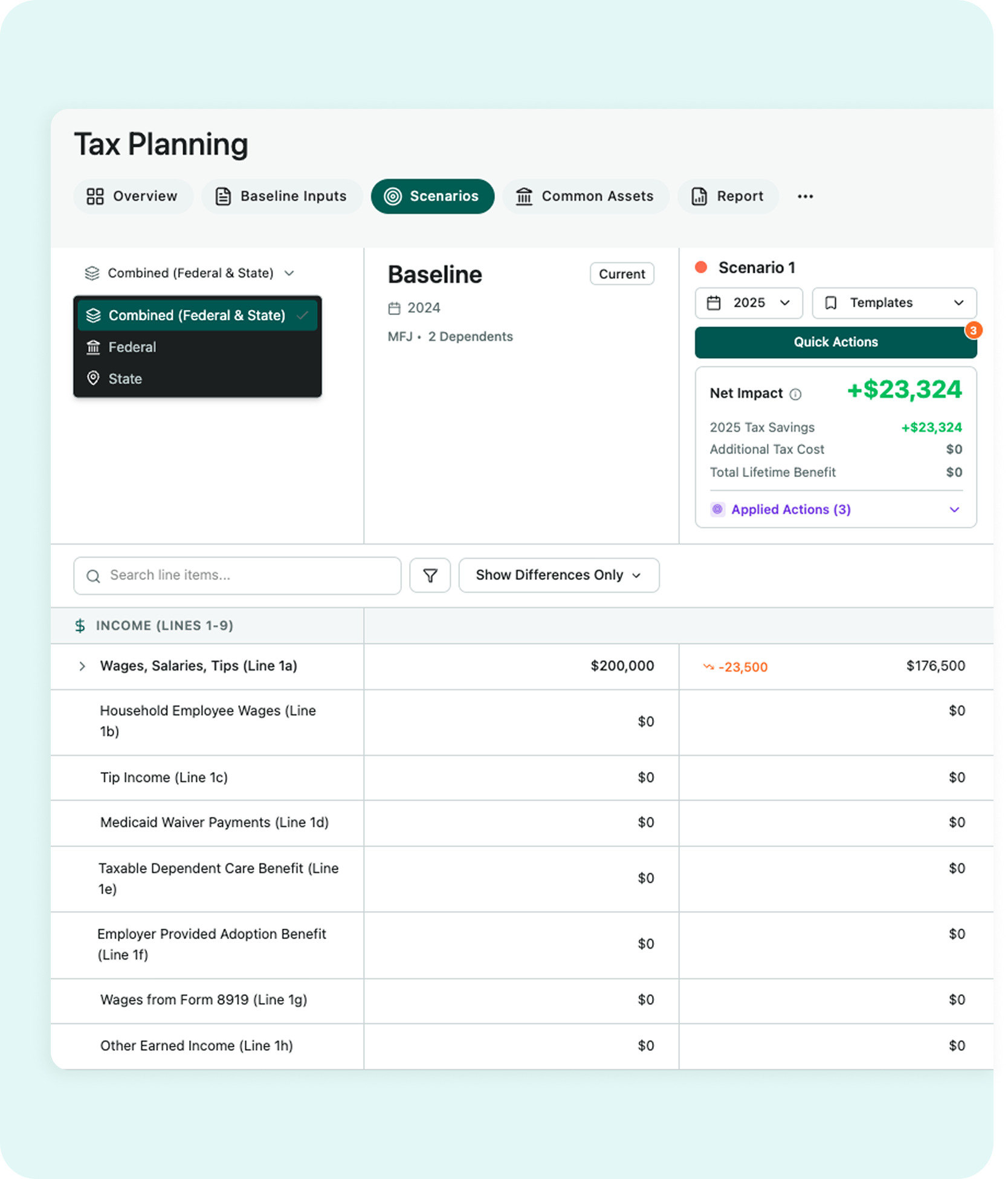 - Look Forward. See what’s coming. Generate a Baseline Report that recalculates historical data against future tax rates and updated standard deductions. Want to see the impact of a salary change? Just adjust the inputs to generate a Projected Report instantly.