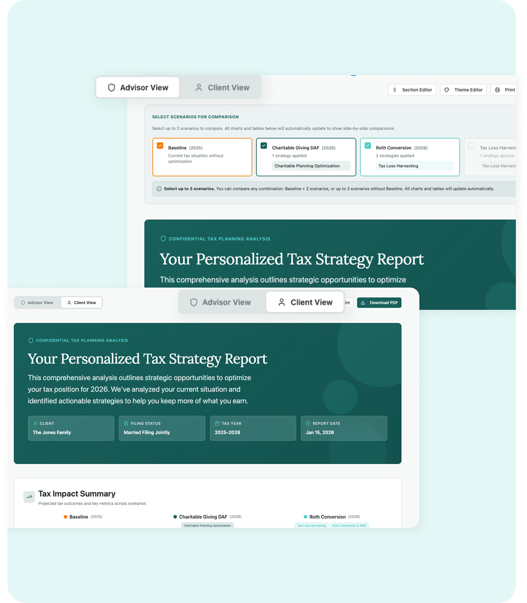 Toggle between a granular “Advisor View” for deep work and a polished “Client View” for the boardroom.